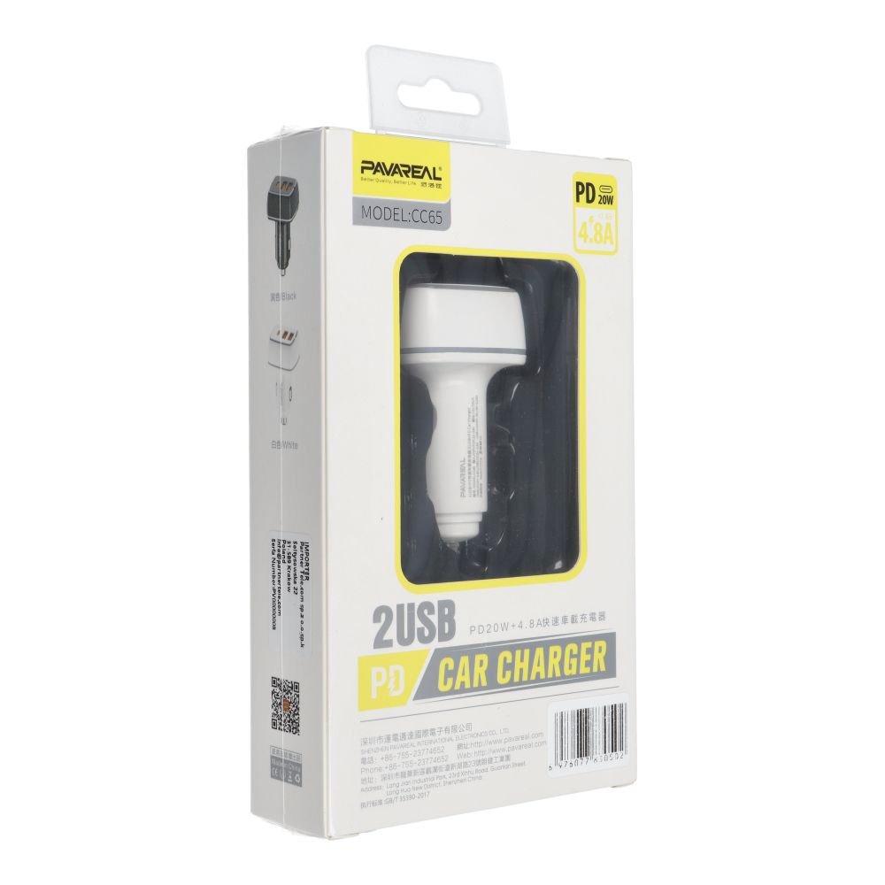 Auto įkroviklis PAVAREAL Type C PD 20W + 2x USB 4,8A PA-CC65 – Baltas