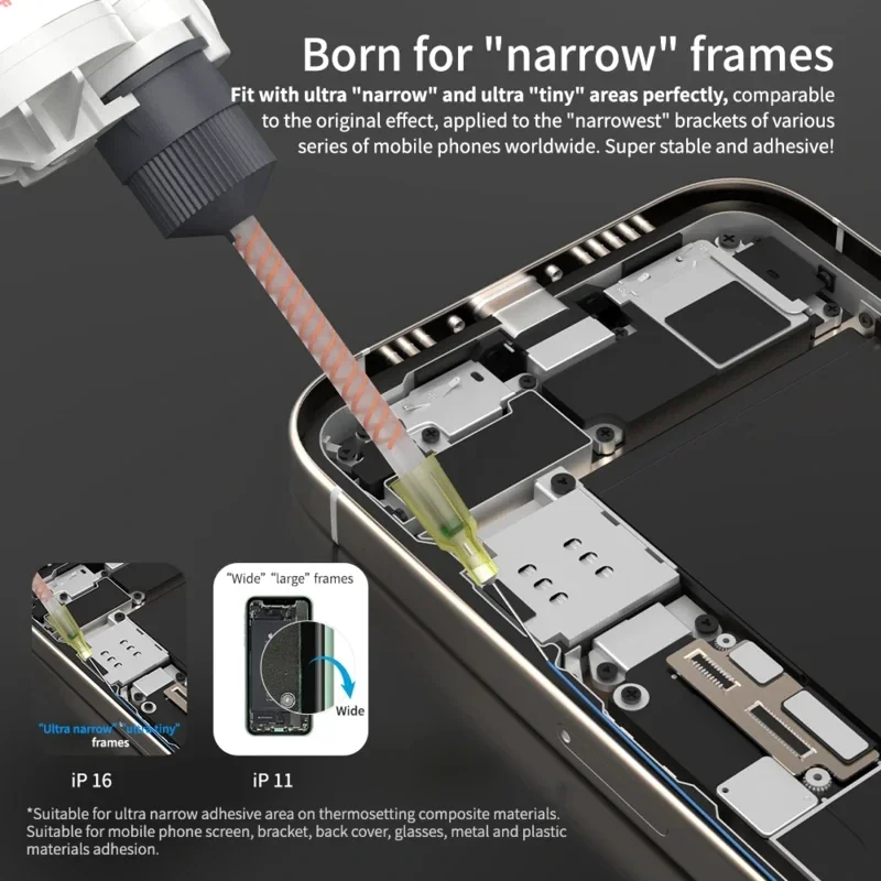 Tikslus užtepimas: dėl tirštos konsistencijos klijai leidžia tiksliai ir kontroliuojamai užtepti ant mažų, tikslių mobiliųjų įrenginių dalių. Juos galima naudoti mažoms dalims, tokioms kaip mygtukai, dėklai ar kiti mobiliųjų telefonų komponentai, klijuoti.